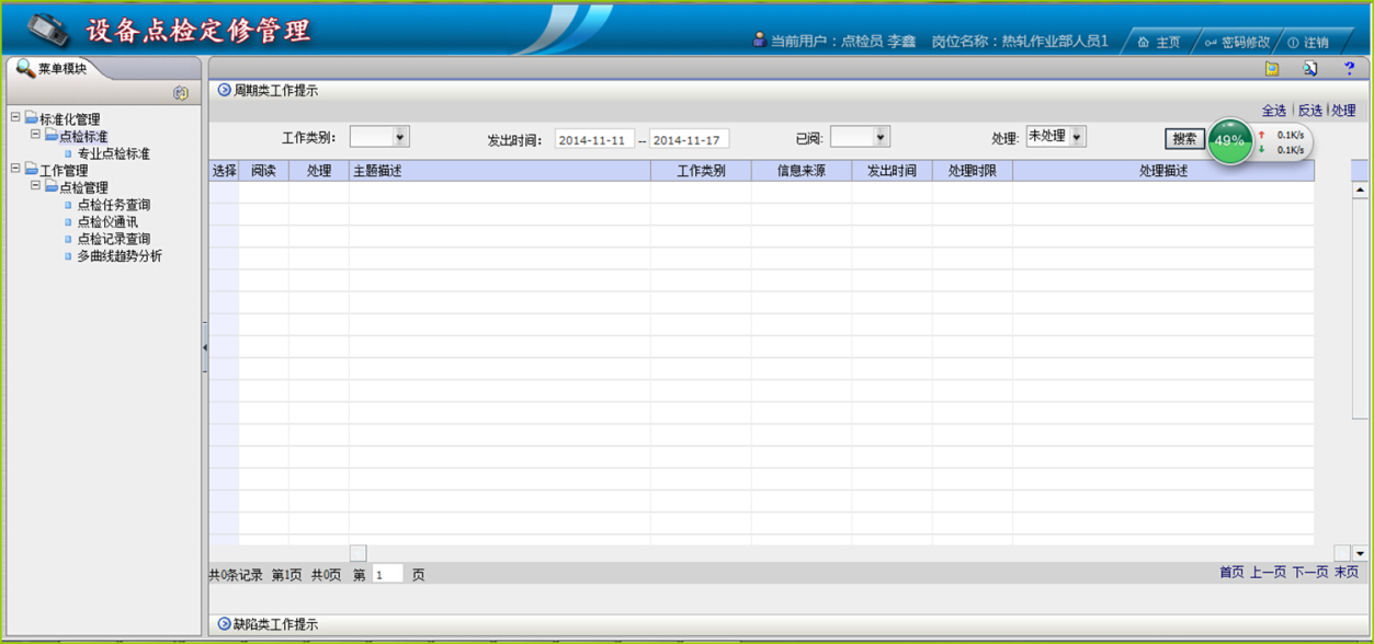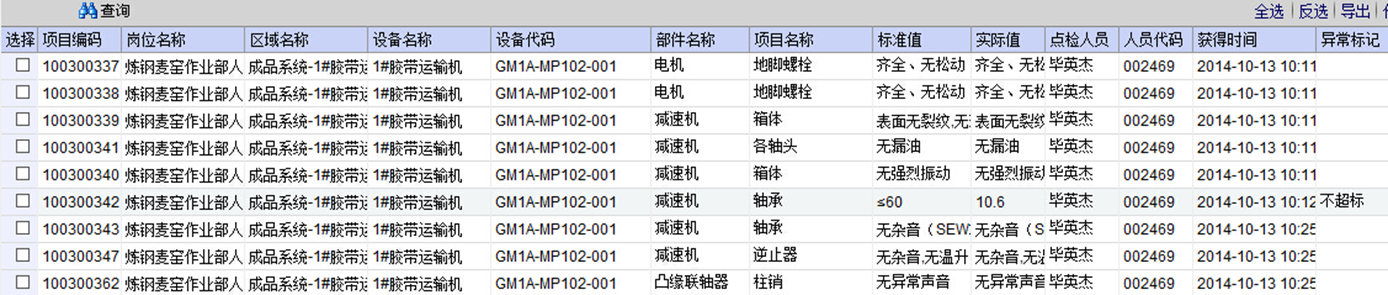 2014年12月,设备点巡检系统对包钢稀土钢板材公司的炼铁作业部、炼钢作业部、热轧作业部、能环作业部、设备管理部5个部门,389个区域,498台设备,共28条路线进行定点定期的数据采集和点检,形成有点检应用特色的点检样板工程。